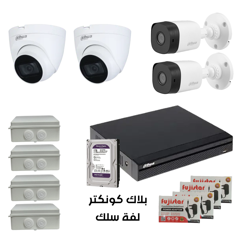 باكج دهوا 2 ميجا4 كاميرات من اختيارك داخلي او خارجيلفة سلكهارد ديسك 1 تيرابلاك كونكتر4 محولات4 علب واتر بروف